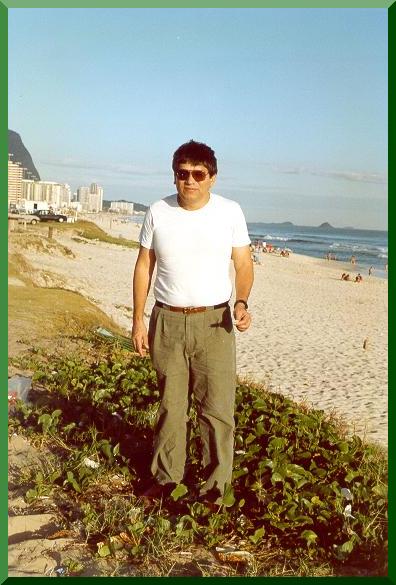 On the beach at Barra de Tijuca, Rio de Janeiro, Brazil, waiting for my clothes to arrive on next plane, January 1990.